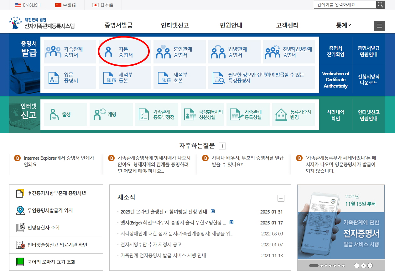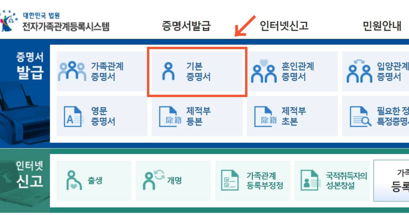 - '가족관계등록' 메뉴에서 '기본증명서'를 선택합니다.