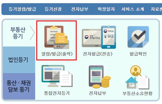 • '등기열람/발급' 메뉴 선택