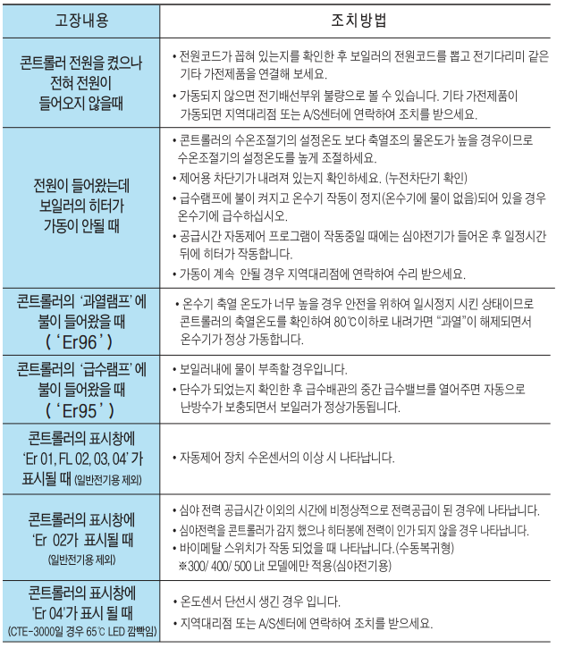 | 증상 | 보일러 고장 원인 | 해결 방법 |