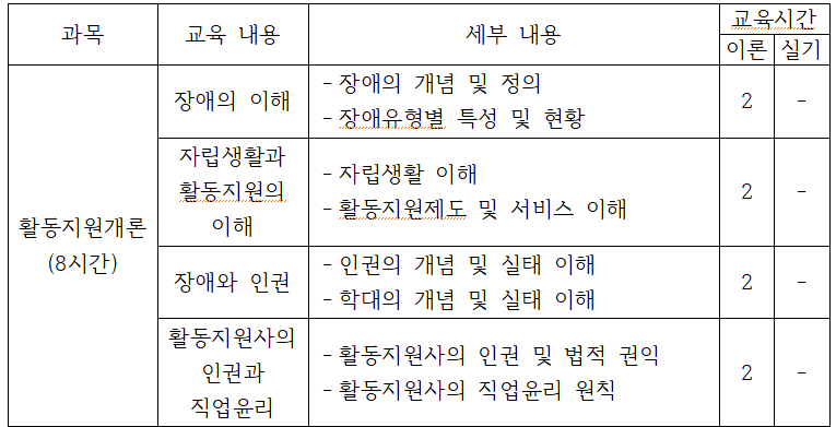 2025년 기준으로 교육과정은 총 50시간으로 구성되어 있으며, 이론과 실습으로 나뉩니다. 한국장애인고용공단의 가이드라인에 따라 진행됩니다.
