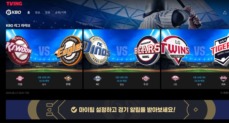 - 티빙(TVING): KBO 리그 단독 중계권을 보유하여 PC와 모바일 모두에서 프로야구 중계 제공